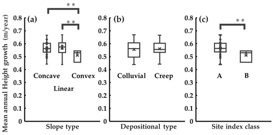 Relationship between site condition and tree growth: (a) relationship between slope type and height; (b) relationship between depositional type and height; (c) relationship between site index class and height. Asterisks indicate statistical significance: ** p < 0.01.