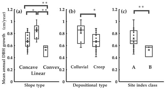 Relationship between site condition and tree growth. (a) Relationship between slope type and diameter at breast height (DBH) growth; (b) depositional type and DBH growth; (c) site index class and DBH growth. Asterisks indicate statistical significance: * p < 0.05, ** p < 0.01.