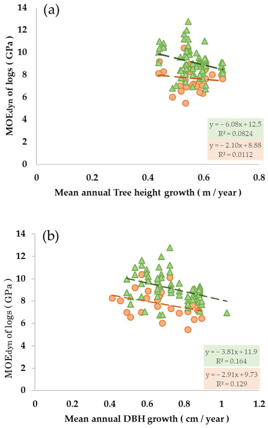 Relationship between log and tree growth by bucking position. (a) Relationship between of logs and height growth by bucking position; (b) relationship between of logs and diameter at breast height (DBH) growth by bucking position; data from the bottom log is shown in orange and data from the upper log in green.