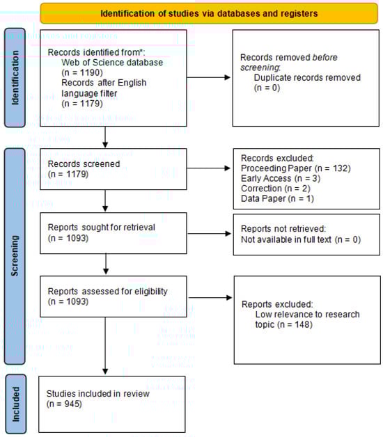 Due to the dynamic nature of the Web of Science database, literature records may be updated, added, or deleted at any time. To ensure data consistency and avoid discrepancies arising from different time periods, we conducted the literature search on 25 March 2025. The time range was set from 1 January 2000 to 25 March 2025. The initial search yielded a total of 1190 documents; after limiting the language to English, the number of documents was reduced to 1179. Subsequently, we retained only Article and Review Article types, excluding Proceeding Papers (132), Early Access (3), Corrections (2), and Data Papers (1), resulting in 1093 candidate documents. To ensure the relevance and accuracy of the sample, the research team employed a manual screening method involving two independent reviewers, who eliminated documents with low relevance to the research topic based on their titles and abstracts. After consistency testing, 945 highly relevant documents were ultimately included in the analysis sample. This process strictly adheres to the PRISMA 2020 guidelines to ensure the authority of the data source and the scientific rigor of the analysis. The screening process is illustrated in Figure 1.