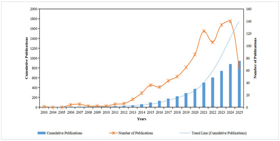 Annual trend and cumulative growth of publications on green infrastructure for mitigating the urban heat island effect, 2003–2025; blue bars indicate cumulative publications (left axis), the orange line with markers shows annual publications (right axis), and the blue dotted line represents the fitted trend of cumulative growth.