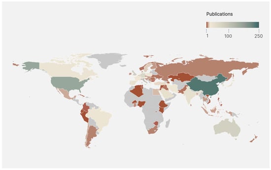 The number of publications and their global citation counts serve as key indicators of a country’s scientific capacity and academic influence [41,42]. Figure 3 illustrates the geographic distribution of research outputs in this field by country and region.