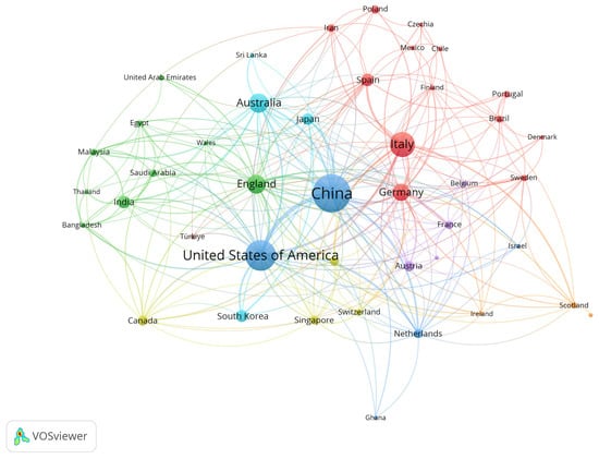 To further elucidate international collaboration patterns in the field of GI aimed at mitigating UHI effects, this study employs VOSviewer to construct a national collaboration network map (see Figure 4). As illustrated in Figure 4, cooperation among countries exhibits distinct multi-center and clustering characteristics. Countries such as China, the United States, the United Kingdom, Italy, Australia, Germany, and India occupy central positions in scientific collaborations within this domain. China, characterized by the largest node size, demonstrates significant output and extensive international cooperation, forming close ties with nations like the United States, the United Kingdom, and Australia. The United States also serves as a major hub for international cooperation, maintaining frequent collaborations with several countries across Europe and Asia. European nations, including the United Kingdom, Italy, and Germany, display strong cooperation, often engaging in cross-continental collaborations with China and the United States. Additionally, Australia, Japan, Canada, and the Netherlands hold prominent positions in the international cooperation network, facilitating global academic resource sharing and technological exchange. Overall, the current collaboration network among countries not only reflects international trends in the field of GI for mitigating UHI but also underscores the collective efforts of the global academic community to address urban environmental and climate change challenges. This multi-center, high-density international collaboration model fosters the exchange and integration of knowledge, technology, and management experiences across diverse regions, promoting the global dissemination of cutting-edge theories and innovative findings. Furthermore, the leadership of developed countries, coupled with the participation of developing nations, ensures a balance between theoretical depth and practical application in research, thereby enhancing the diversity and applicability of outcomes. As the collaboration network continues to evolve, it is anticipated to achieve a higher level of global collaborative innovation, providing more robust scientific support for sustainable urban development and climate adaptation management.