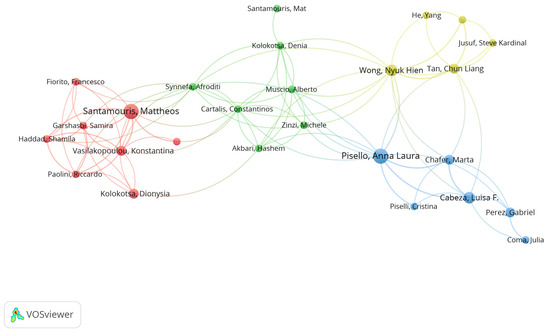 The overall network structure reveals relatively close collaborations among authors, forming several well-defined research groups. Notably, the red cluster, led by Satamouris Mattheos, stands out as one of the most active and stable collaborative networks in this field. This group includes collaborators such as Vasilakopoulou Konstantina, Garshasbi Samira, and Kolokotsa Dionysia, indicating a regional collaboration pattern centered around Greek research institutions. The strong internal connections and frequent academic interactions within this cluster have significantly contributed to knowledge accumulation in the field.