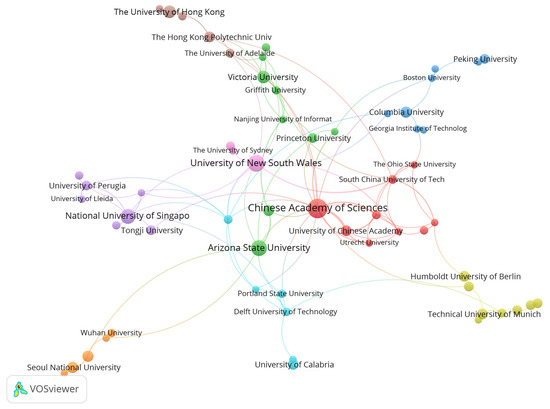 The overall structure of the network illustrates a densely connected, multi-centric collaboration pattern, indicative of a high density of academic cooperation and active international partnerships within this research domain. The Chinese Academy of Sciences occupies a central position in the network, characterized by the largest node size, signifying its prominent influence and leadership in collaborative research efforts. It maintains robust partnerships with domestic institutions such as Nanjing University, Tongji University, Tsinghua University, and East China Normal University, as well as with internationally renowned universities like the National University of Singapore and the University of New South Wales.