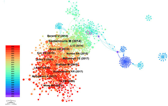 Reference co-citation network in publications on green infrastructure for mitigating the urban heat island effect, 2003–2025; each node represents a cited reference, node size indicates co-citation frequency, links denote co-citation relationships, and colors represent time periods assigned by the VOSviewer time-slice algorithm, with red indicating more recent co-cited references and blue–green representing earlier citation hotspots.