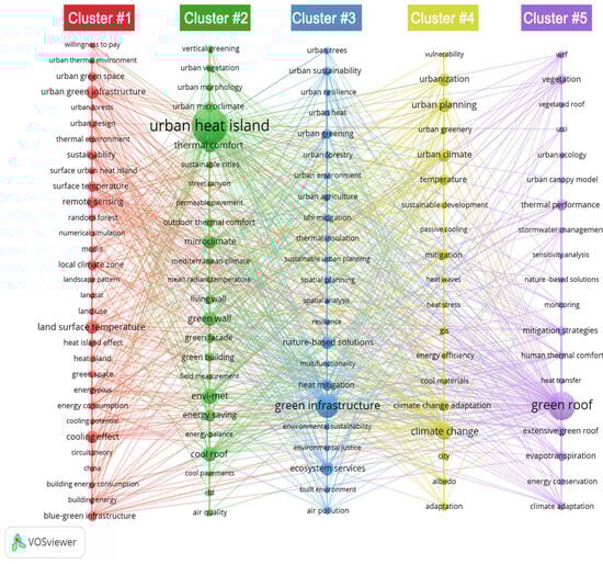 Keyword co-occurrence network in publications on green infrastructure for mitigating the urban heat island effect, 2003–2025; node size represents keyword frequency, links indicate co-occurrence relationships, and clusters were identified using the modularity-based clustering algorithm implemented in VOSviewer. The five main clusters are as follows: Cluster 1—Remote Sensing and Urban Thermal Environment Modeling; Cluster 2—Microclimate Regulation and Thermal Comfort; Cluster 3—Urban Sustainability and Ecosystem Services; Cluster 4—Urban Planning and Policy Integration; Cluster 5—Green Roofs and Building-Level Interventions.