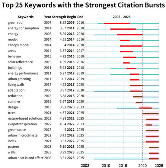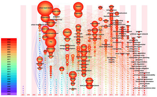 To comprehensively elucidate the developmental trajectory and emerging trends in research on GI for mitigating UHI effects, this study utilized CiteSpace to construct a temporal keyword co-occurrence map (Figure 9) and to identify the top 25 keywords exhibiting the strongest citation bursts over the past 25 years (Figure 10). In the Keyword Change Map, the horizontal axis represents the temporal span, while the vertical axis reflects keyword frequency and interrelations. The size of each node corresponds to the frequency of keyword occurrences, with color variations indicating periods of heightened activity. Connecting lines illustrate co-occurrence relationships. In the burst detection map, red lines signify the duration of a keyword’s burst period, while blue lines indicate the overall presence of the keyword. The “strength” metric quantifies the intensity of the burst, and the “begin” and “end” labels denote the onset and conclusion of each burst period.