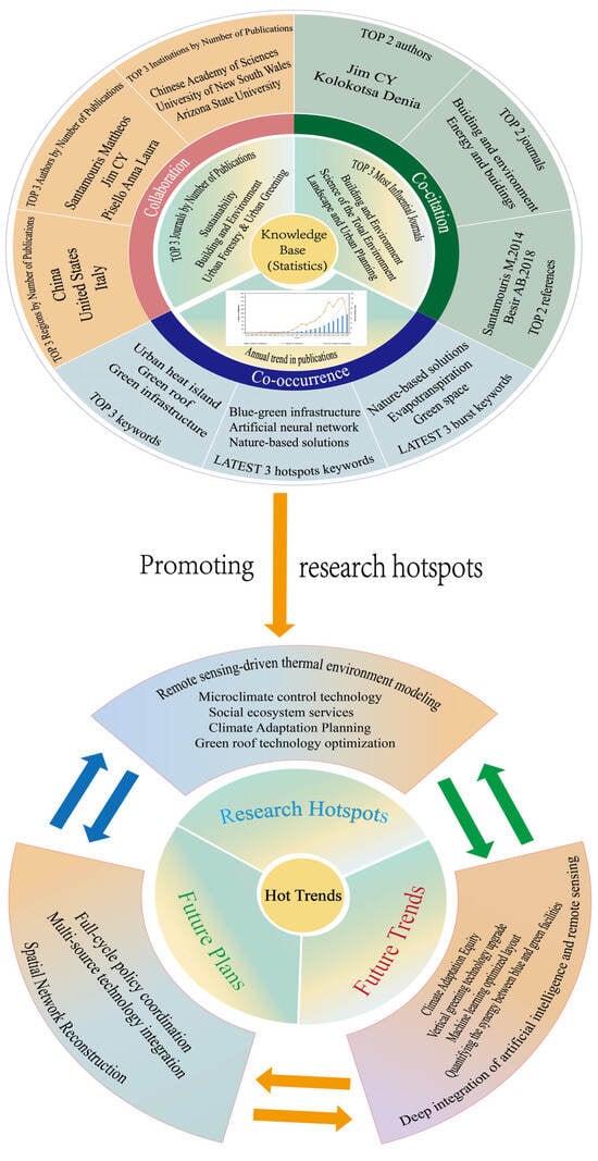 Bibliometric analysis is an interdisciplinary research method that integrates mathematics, statistics, and computer technology to quantitatively analyze and deeply mine scientific literature [40]. In this study, bibliometric methods, combined with advanced data analysis and visualization tools, were employed to systematically review and analyze the literature on the role of GI in mitigating UHI from 2000 to 2025.