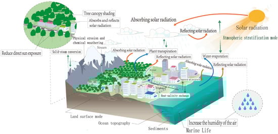 Cities, as epicenters of human civilization, play a crucial role in societal advancement [1]. These regions concentrate the majority of the world’s economic activities, innovative resources, and infrastructure, generating approximately 80% of global GDP and profoundly influencing the trajectory of modern societal development [2]. According to the United Nations Department of Economic and Social Affairs’ 2018 Revision of the World Urbanization Prospects report, the global urban population is projected to increase by 2.5 billion by 2050, resulting in 68% of the world’s population living in urban areas [3]. However, the rapid pace of urbanization and intensified human activities have led to a gradual rise in global urban temperatures, disrupting the local energy balance and giving rise to the UHI effect [4]. This phenomenon poses significant threats to public health and urban ecosystems, resulting in substantial economic losses [5,6,7]. Currently, the UHI effect poses a significant global challenge [8]. This issue is especially pronounced in developing countries, where urbanization is progressing rapidly [9]. Such accelerated urbanization is expected to exacerbate both the UHI effect and global warming, resulting in an increase in heat-related illnesses and fatalities [10,11,12]. A study by Vicedo-Cabrera et al. (2021), utilizing empirical data from 732 locations across 43 countries/regions, found that, over a 27-year period from 1991 to 2018, human-induced climate change accounted for 37% of deaths related to warm-season high temperatures [13,14]. Urban areas are warming at a significantly faster rate than rural regions due to human activities and alterations in land surface environments. Addressing this challenge necessitates the urgent formulation of effective strategies to mitigate the UHI effect [15].