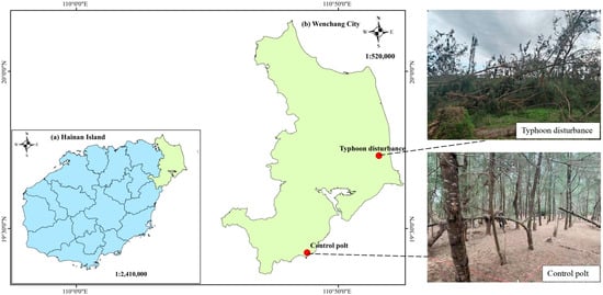 This study examined Casuarina equisetifolia L. plantations following Typhoon Yagi in September 2024. Three fixed plots were randomly established in typhoon-disturbed areas with uniform soil conditions, each separated by over 30 m. In addition, three undisturbed control plots were established in the adjacent areas (Figure 1). Both the disturbed and control plots measured 20 m × 30 m, resulting in a total of six plots. The vegetation characteristics of the control and disturbance plots are summarized in Table 1.