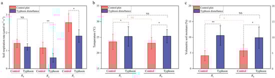 Effects of typhoon disturbance on soil respiration components (a), T5 of each component (b), and W10 of each component (c) in Casuarina equisetifolia L. plantations. Note: *, **, and NS denote significant differences at p < 0.05, p < 0.01, and no significant differences, respectively.