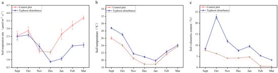As shown in Figure 3a, Rs exhibited significant temporal variation within seven months following typhoon disturbance (p < 0.05), displaying an inverted single-peak trend. In both the control and disturbance plots, Rs initially decreased and subsequently increased. In the control plot, the maximum and minimum Rs values were recorded in March (3.69 ± 0.27 μmol·m−2·s−1) and December (1.48 ± 0.11 μmol·m−2·s−1), respectively. In the typhoon-disturbed plot, the corresponding values occurred in October (2.60 ± 0.25 μmol·m−2·s−1) and December (0.87 ± 0.05 μmol·m−2·s−1).