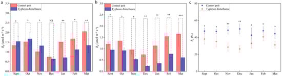 Effects of typhoon disturbance on dynamic trends of Rh (a), Ra (b), and Rc (c) in Casuarina equisetifolia L. plantations. Note: *, **, ***, and NS denote significant differences at p < 0.05, p < 0.01, p < 0.001, and no significant differences, respectively.
