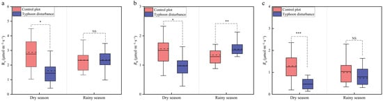 Effects of typhoon disturbance on seasonal trends of Rs (a), Rh (b), and Ra (c) during the dry and rainy seasons in Casuarina equisetifolia L. plantations. Note: *, **, ***, and NS denote significant differences at p < 0.05, p < 0.01, p < 0.001, and no significant differences, respectively. In the box plots, the dashed line within each box represents the median, and the solid line represents the mean.