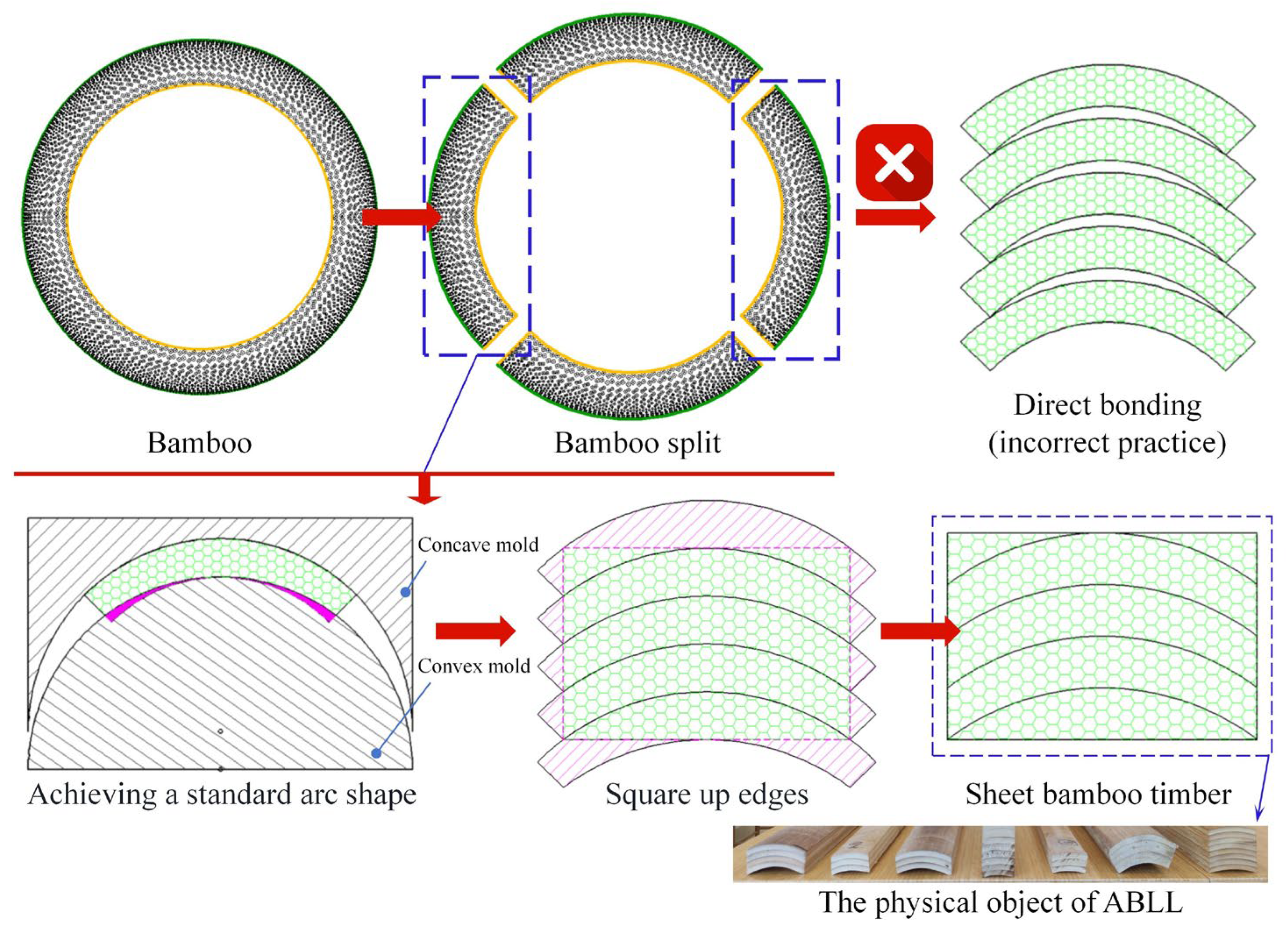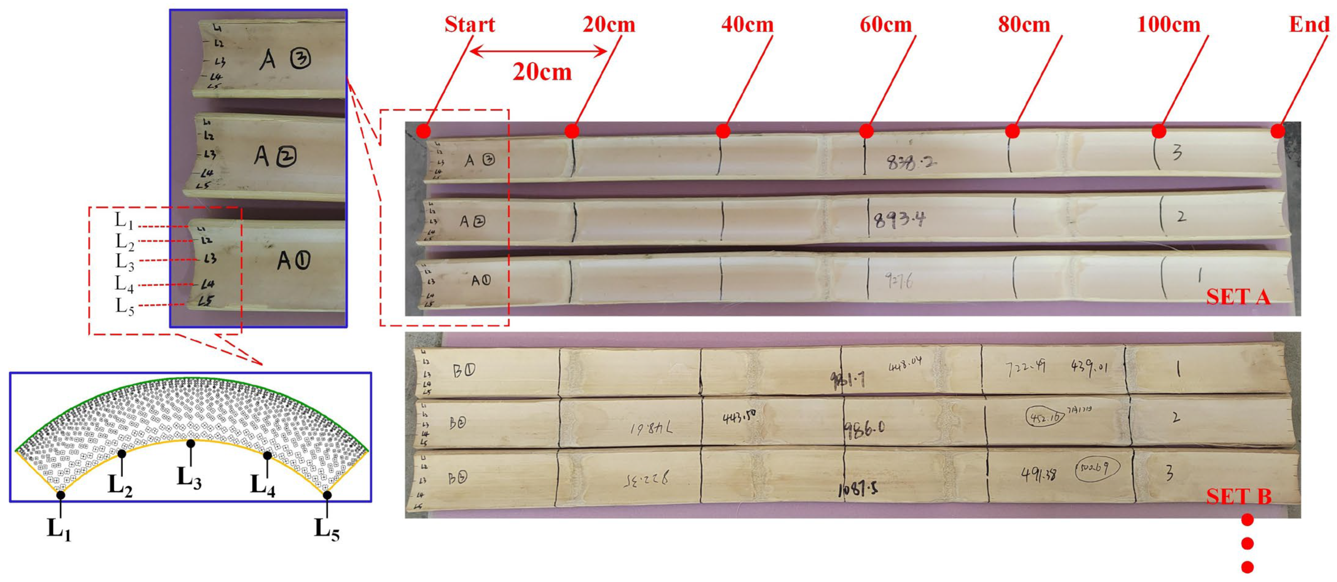 - Huang, B.; Fang, C.; Chen, L.; Miao, H.; Ma, X.; Liu, H.; Fei, B. Analysis of the use rate of equal arc-shaped bamboo splits. Constr. Build. Mater. 2021, 302, 124273. [Google Scholar] [CrossRef]