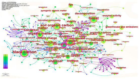 Keyword clustering map of biochar application in forest soil carbon sequestration research (1996–2025).