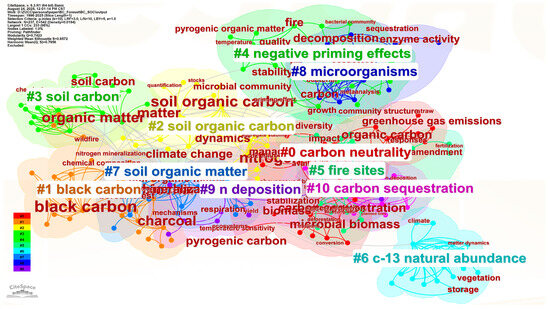 We conducted a keyword cluster analysis using the Log-likelihood Ratio method and identified ten thematic clusters (Figure 2). One major cluster center on “black carbon” reflecting foundational studies on the stability and long-term carbon retention properties of biochar. Other prominent clusters focus on “soil organic carbon” and “soil organic matter” emphasizing biochar’s role in enhancing soil carbon pools and improving soil fertility. Themes related to “negative priming effects”, “microorganisms”, and “deposition” highlight growing interest in microbial dynamics and biogeochemical interactions influenced by biochar amendments. The presence of clusters such as “carbon neutrality” and “fire sites” suggests a broader ecological and climate-related context, linking biochar research to carbon offset strategies and post-fire soil recovery. Additionally, the inclusion of “C-13 natural abundance” indicates the use of isotopic techniques to trace carbon cycling processes.