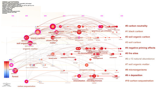 Figure 3 illustrates the timeline map of keyword clusters concerning biochar application in forest soil carbon sequestration, revealing the temporal evolution of research themes from 1996 to 2023. Early studies (1996–2005) were primarily centered on fundamental concepts such as “black carbon”, “organic matter”, and “soil organic carbon”, reflecting initial efforts to understand biochar’s basic properties and its interaction with forest soils. Between 2006 and 2015, the focus expanded to include mechanistic processes, with increased attention to keywords like “microbial biomass”, “mineralization”, and “carbon sequestration”. From 2016 onward, there was a notable rise in keywords related to climate relevance, such as “carbon neutrality”, “greenhouse gas emissions”, and “climate change mitigation” indicating a strategic shift toward policy-oriented and global impact research.