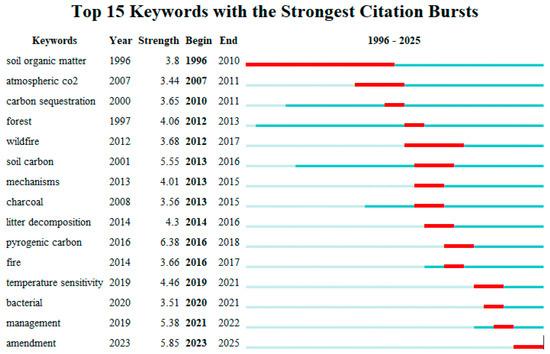 Figure 4 displays the burst keywords map, highlighting the top 15 keywords with the strongest citation bursts in research on forest soil carbon sequestration under biochar application from 1996 to 2025. The earliest burst occurred for “soil organic matter” beginning in 1996 and lasting until 2010, indicating foundational interest in soil composition. Keywords such as “atmospheric CO2” and “carbon sequestration” showed strong bursts between 1998 and 2012, reflecting growing attention to climate-related functions of biochar. From 2010 onward, emerging keywords like “wildfire”, “pyrogenic carbon”, and “temperature sensitivity” gained prominence, suggesting a shift toward understanding biochar’s role in dynamic forest processes and carbon stability. Notably, recent bursts include “bacterial” (2021–2025), “management” (2023–2025), and “amendment” (2023–2025), pointing to a current emphasis on microbial interactions and practical implementation strategies.
