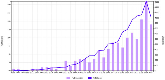 Figure 5 illustrates the global annual publication volume and citation trends related to biochar application on forest soil carbon sequestration from 1996 to 2025. The number of publications remained low and relatively stable before 2008, followed by a gradual increase between 2009 and 2016. A notable surge occurred after 2017, with publication output peaking in 2023 at over 40 articles. Citations also showed a sharp upward trajectory, particularly from 2018 onward, reaching a maximum of over 1300 citations in 2023. Although both publications and citations slightly declined in 2024, the overall trend reflects growing global interest and academic recognition of biochar’s role in forest soil carbon dynamics.