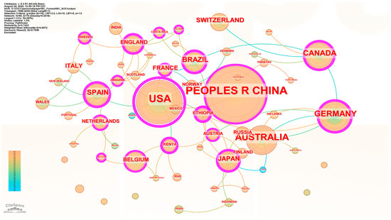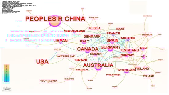 The national publication map illustrates global research activity on biochar application for forest soil greenhouse gas mitigation (Figure 13). China and the United States were the most active contributors, with China showing the highest publication volume. Australia, Canada, and Germany also demonstrated strong research output, forming key nodes in the global collaboration network. Other countries with notable contributions included Japan, Spain, England, France, and Brazil, while emerging participation was observed from nations such as Ethiopia, India, and Poland.