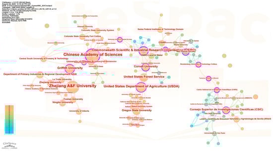 Figure 7 presents the institutional collaboration network in the field of biochar application for forest soil carbon sequestration. The Chinese Academy of Sciences and Zhejiang A&F University are the most productive institutions, with 25 and 24 publications, respectively. Other institutions with more than 10 publications include the United States Department of Agriculture (USDA), the Commonwealth Scientific and Industrial Research Organization (CSIRO), Griffith University, and the United States Forest Service. These organizations demonstrate sustained research activity and frequent collaboration across national boundaries. Additional contributors with fewer than 10 publications include Consejo Superior de Investigaciones Científicas (CSIC), Cornell University, Oregon State University, and the State Key Laboratory of Soil and Sustainable Agriculture.