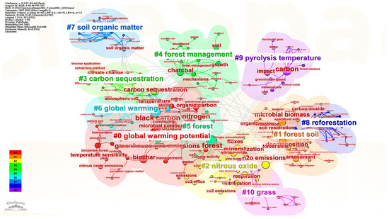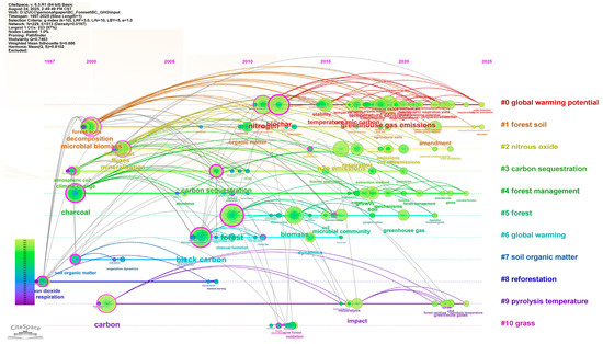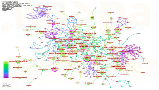 The keyword cluster map identified several thematic groups related to forest greenhouse gas emissions under biochar application (Figure 9). Major research areas included “carbon sequestration”, “forest management”, “global warming potential”, and “nitrous oxide”, reflecting core scientific interests in carbon storage strategies, land use practices, and the mitigation of climate-relevant gases. Other clusters such as “pyrolysis temperature”, “microbial biomass”, and “soil organic matter” emphasized the influence of biochar production conditions and soil biological activity on emission dynamics. These themes suggest a strong focus on how biochar characteristics and microbial interactions shape greenhouse gas fluxes in forest soils. Keywords like “grass” and “forest soil” pointed to broader ecological contexts, including vegetation type and soil heterogeneity, which may affect biochar performance and long-term carbon stability.