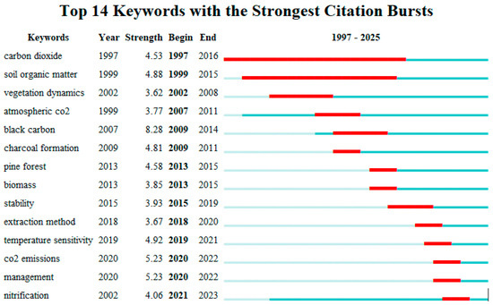 The burst keywords map highlighted the top fourteen keywords with the strongest citation bursts in research on forest soil greenhouse gas emissions under biochar application from 1997 to 2025 (Figure 11). Early bursts included “carbon dioxide”, beginning in 1997 and lasting until 2016, and “soil organic matter” from 1999 to 2015, reflecting foundational interest in carbon dynamics and soil composition. Between 2001 and 2012, keywords such as “vegetation dynamics”, “atmospheric CO2” and “black carbon” showed notable bursts, indicating growing attention to ecosystem-level processes and biochar’s role in atmospheric carbon regulation.