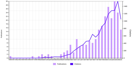 The global annual publication volume on biochar application for forest soil greenhouse gas mitigation showed a clear upward trend from 1997 to 2025 (Figure 12). Before 2010, publication output remained low, with fewer than five articles per year. A steady increase began around 2011, followed by a sharp rise after 2017. The number of publications peaked in 2023 with over 28 articles, while citations reached their highest point the same year, exceeding 1400. Although both metrics slightly declined in 2024, the overall trajectory indicated growing academic interest and recognition of biochar’s role in mitigating greenhouse gas emissions from forest soils. This trend reflects the expanding scope of research in this field, driven by increasing concern over climate change and the need for sustainable land management strategies.