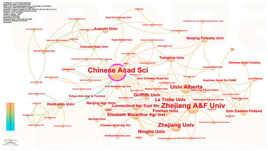The institutional collaboration network revealed active partnerships among global research organizations studying biochar application for forest soil greenhouse gas mitigation (Figure 14). Zhejiang A&F University and the Chinese Academy of Sciences were the most productive institutions, with 27 and 25 publications, respectively. Both have demonstrated sustained research output and extensive collaboration since 2018 and 2010, respectively, forming central hubs in the network. Their partnerships span a wide range of domestic institutions, including Zhejiang University, Ningbo University, and Nanjing Forestry University, as well as international collaborators such as the University of Alberta, Griffith University, and La Trobe University. Other institutions with notable contributions include Elizabeth Macarthur Agricultural Institute, Auburn University, and the United States Forest Service, each publishing between 7 and 10 articles. Additional participants such as Hokkaido University, University of Eastern Finland, and British Columbia University have engaged in collaborative efforts, though with fewer publications.