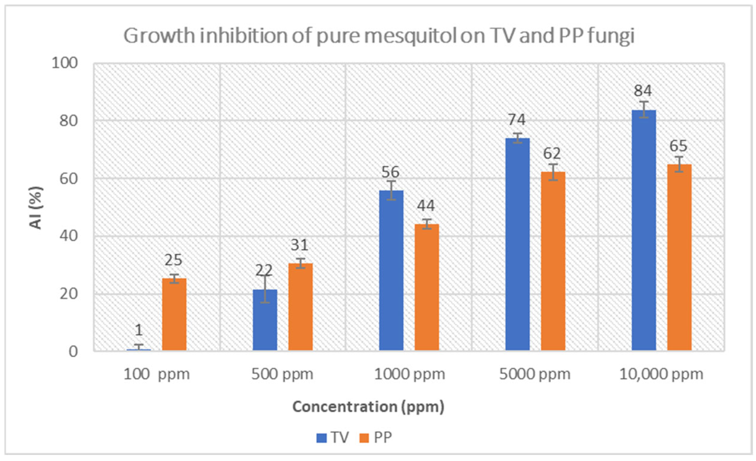 3.3.1. Crude Mesquitol, Pure Mesquitol and Catechin Growth Inhibition of Fungi