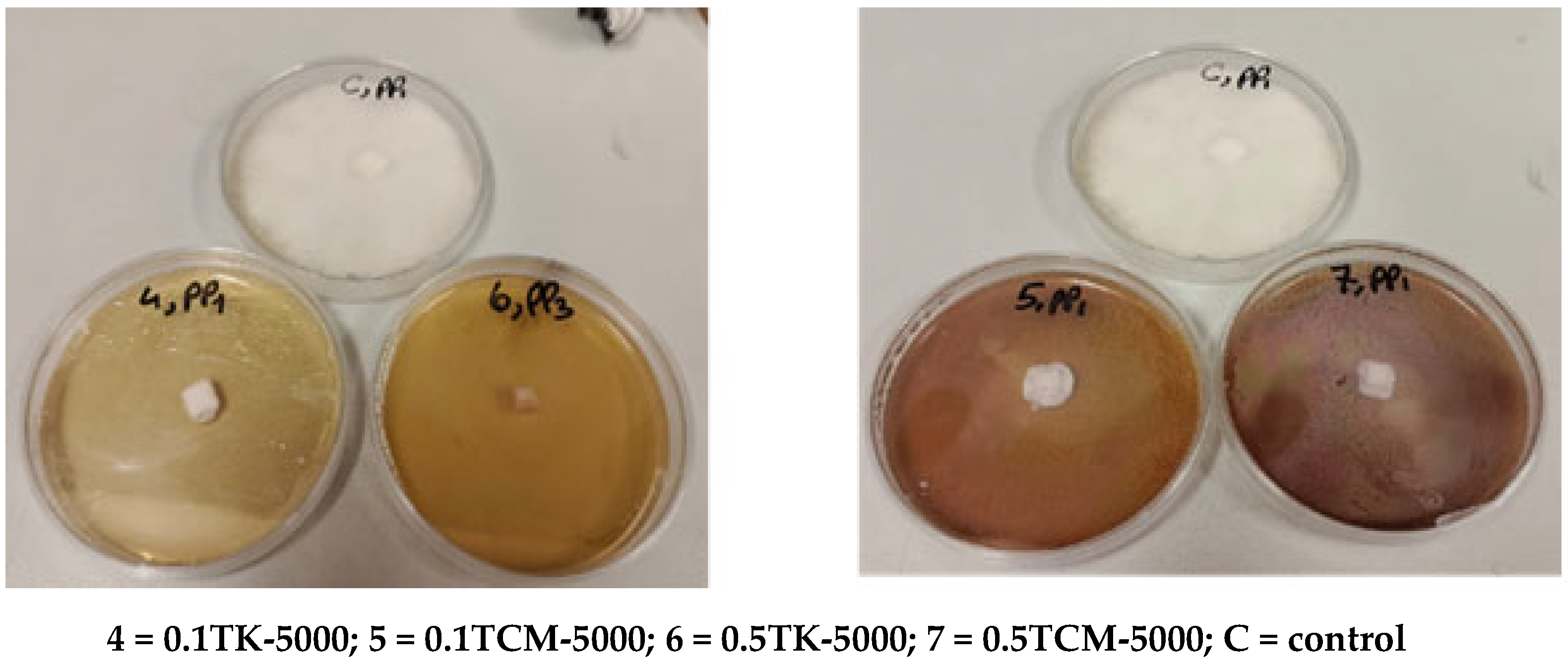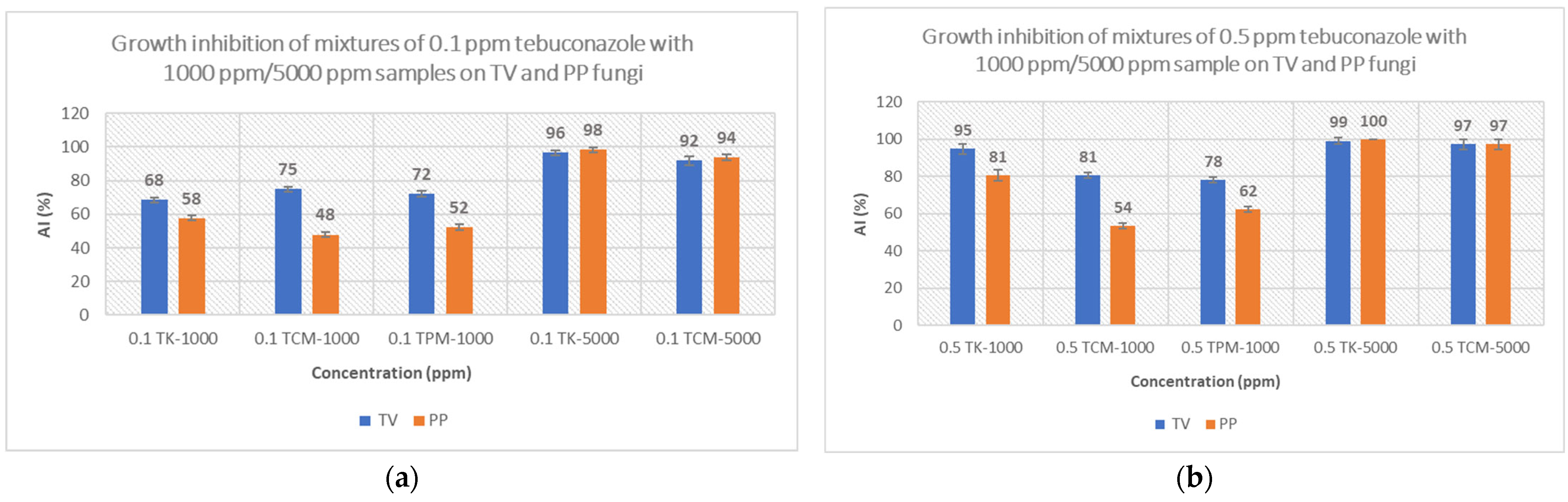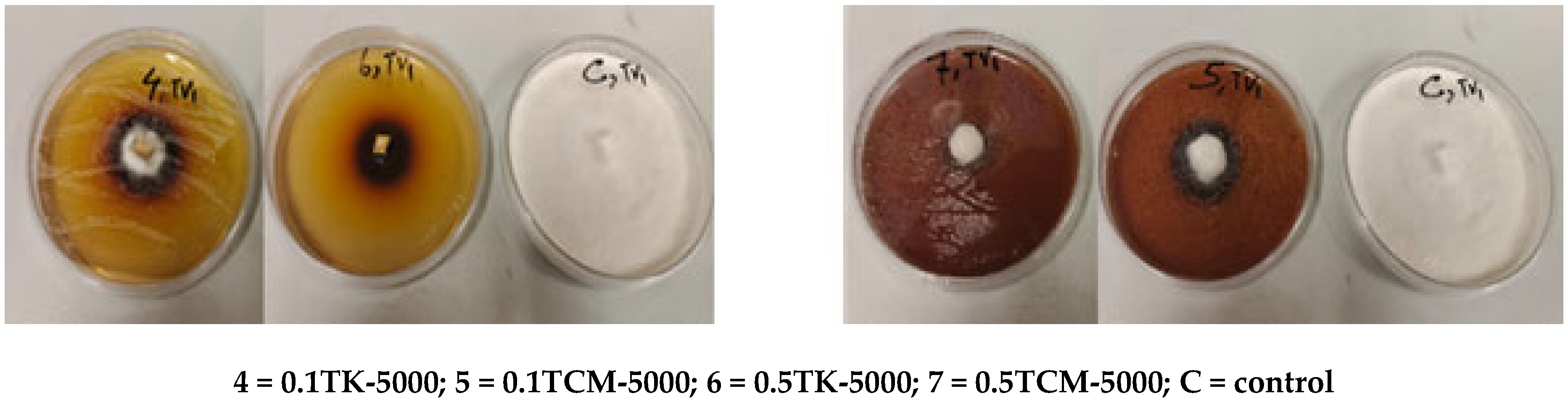 3.3.3. Growth Inhibition of Fungi on 1000 ppm/5000 ppm Sample Mixtures with 0.1 ppm/0.5 ppm Tebuconazole
