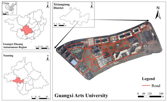 Location and Road Network of Guangxi Arts University Campus, Nanning, China.