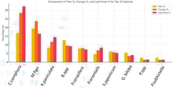 The most abundant species was Mangifera indica (19.4%), followed by Cinnamomum camphora (16.8%), Bauhinia spp. (12.7%), Koelreuteria paniculata (8.3%), Prunus dulcis (7.9%), Styphnolobium japonicum (6.1%), Ginkgo biloba (5.4%), Platanus orientalis (4.6%), Pandanus spp. (2.5%), and Prunus subhirtella (2.5%).
