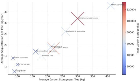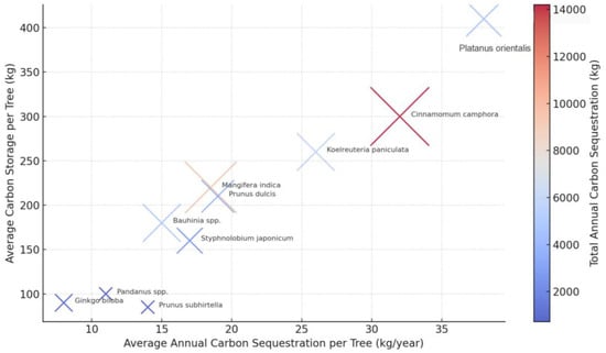 Reducing atmospheric CO2 levels is a vital strategy in addressing the global climate crisis [51]. In this study, carbon storage and sequestration represented the most significant portion of ecosystem services provided by street trees on the Guangxi Arts University (GXAU) campus. The total carbon stored in tree biomass was estimated at 508,230 kg, with annual carbon sequestration reaching 48,580.5 kg—equivalent to approximately 1,864,189 kg of CO2 stored and 178,432 kg of CO2 sequestered each year. On a per-tree basis, the average carbon stored was 194 kg, and annual CO2 sequestration was 18.5 kg, indicating a moderate carbon performance under the humid subtropical monsoon climate of South China [52].