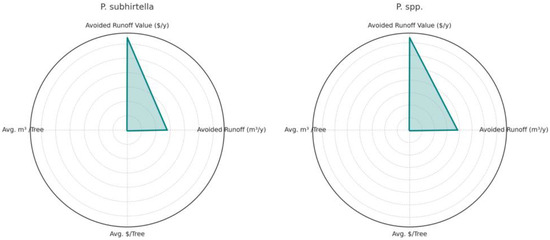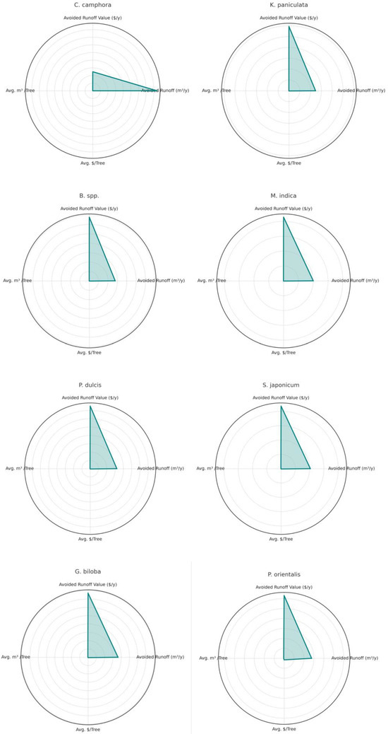 The total avoided runoff attributed to street trees at Guangxi Arts University (GXAU) was estimated at 2352.7 m3 annually, yielding an associated economic value of $5582.6, which reflects the cost savings from reduced reliance on grey infrastructure and flood remediation efforts. Among the dominant species, P. orientalis showed the highest per-tree performance, intercepting 2.2 m3 of runoff and contributing $7.84/tree/year, despite its relatively low planting density. In contrast, C. camphora and M. indica, the most frequently planted species on campus, intercepted only 0.9 m3 and 0.75 m3 per tree, with respective values of $0.27 and $1.61 per tree per year, suggesting a mismatch between planting frequency and hydrological effectiveness.