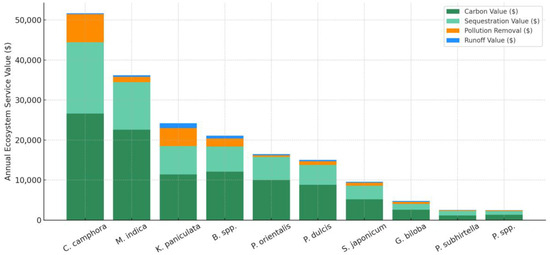 The total annual carbon sequestration by street trees was estimated at 48,580.5 kg, valued at $60,725.37. C. camphora again led in sequestration contribution, accounting for 29.3% of the total, followed by M. indica (19.5%), K. paniculata (11.7%), and B. spp. (10.4%). Average annual sequestration per tree varied from 8.0 kg/year (G. biloba) to 38.0 kg/year (P. orientalis). These values translated into the highest sequestration-related economic returns for C. camphora ($17,760.00) and M. indica ($11,863.12) (Table 3 and Figure 4).
