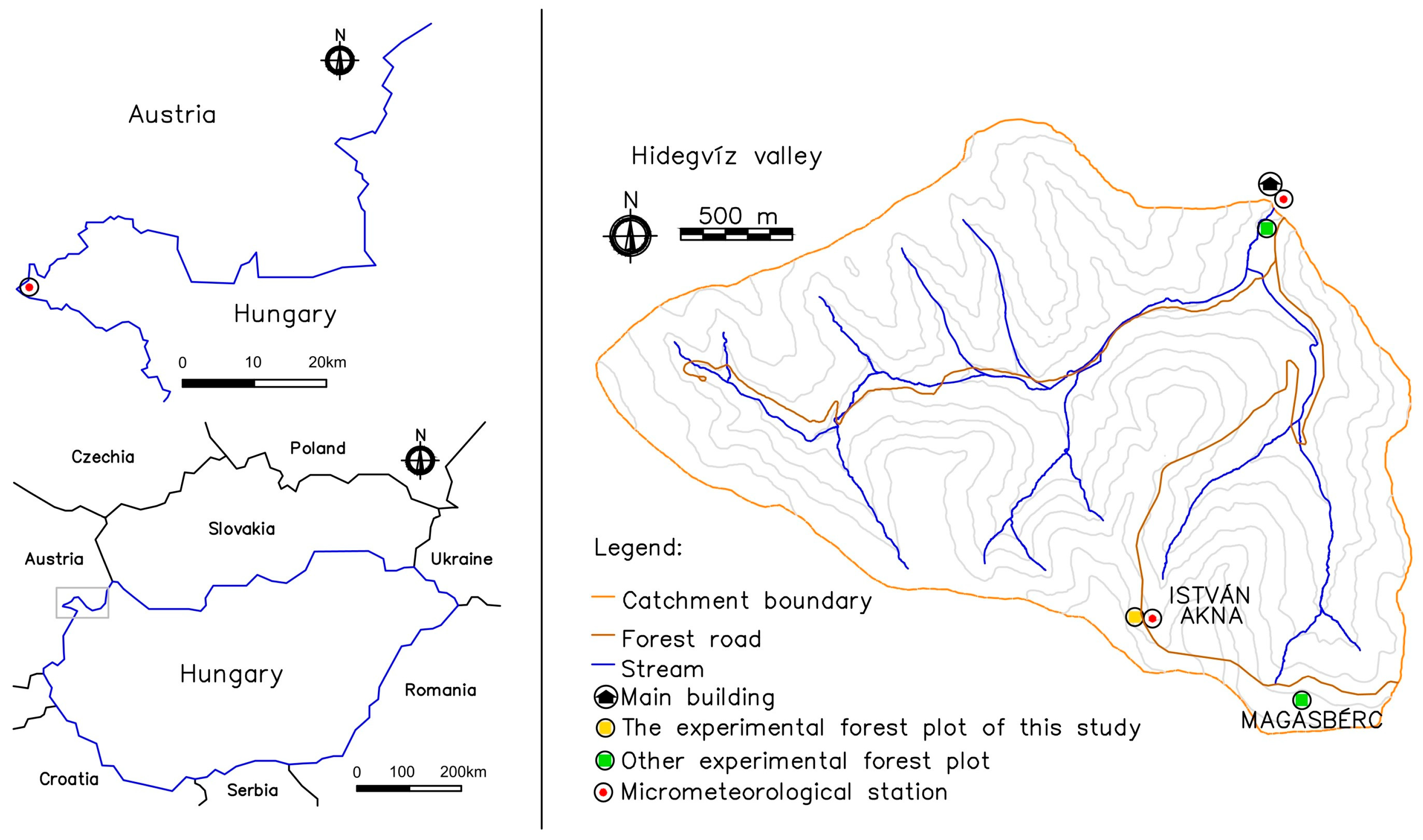 - Gribovszki, Z.; Kalicz, P.; Kucsara, M. Streamflow Characteristics of Two Forested Catchments in Sopron Hills. Acta Silv. Lign. Hung. 2006, 2, 81–92. [Google Scholar] [CrossRef]
