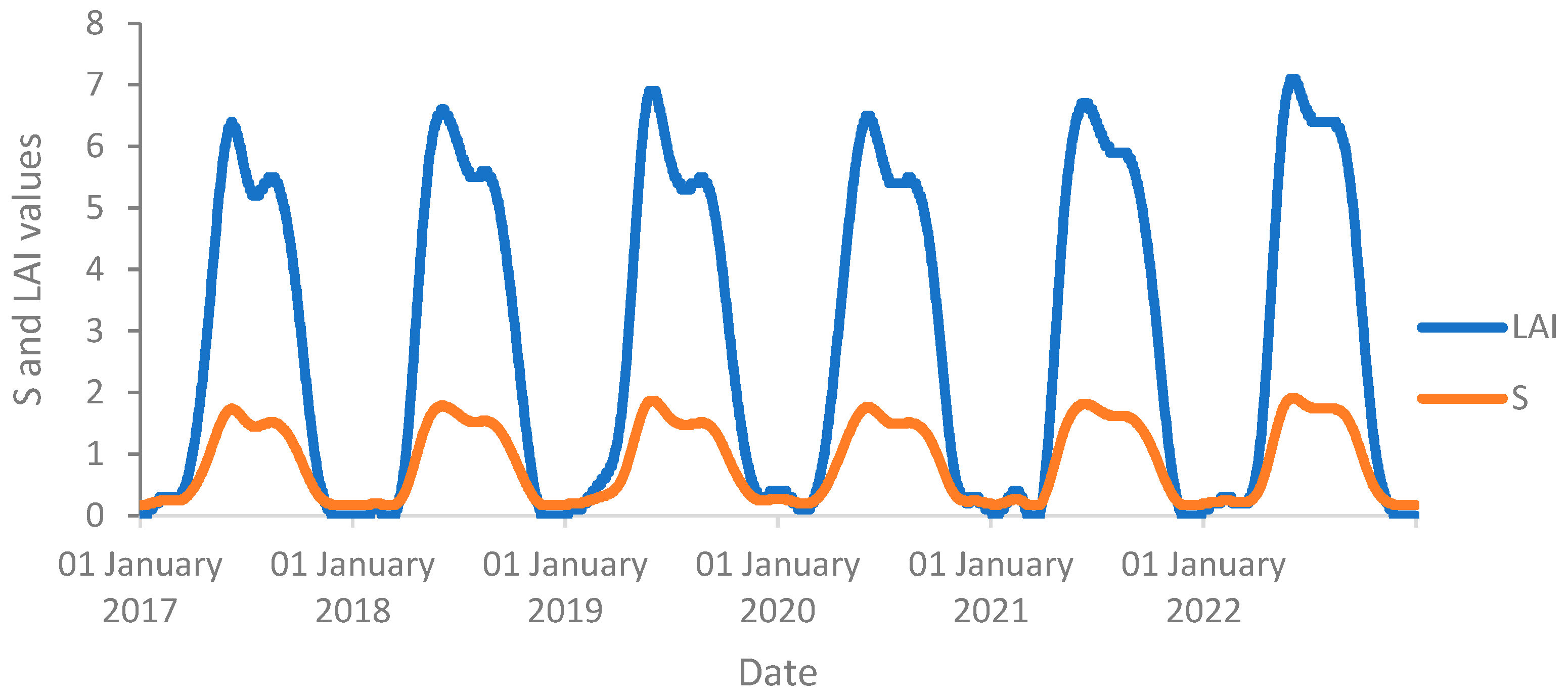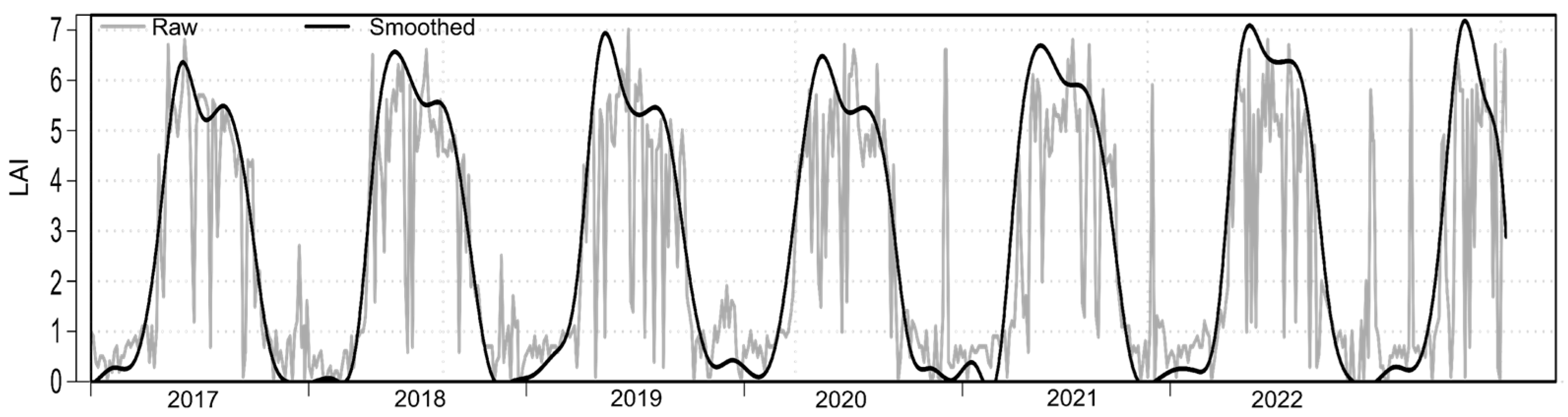 - Myneni, R.; Knyazikhin, Y.; Park, T. MOD15A2H MODIS Leaf Area Index/FPAR 8-Day L4 Global 500m SIN Grid V006; NASA EOSDIS Land Processes DAAC: Sioux Falls, South Dakota, 2015. [Google Scholar] [CrossRef]