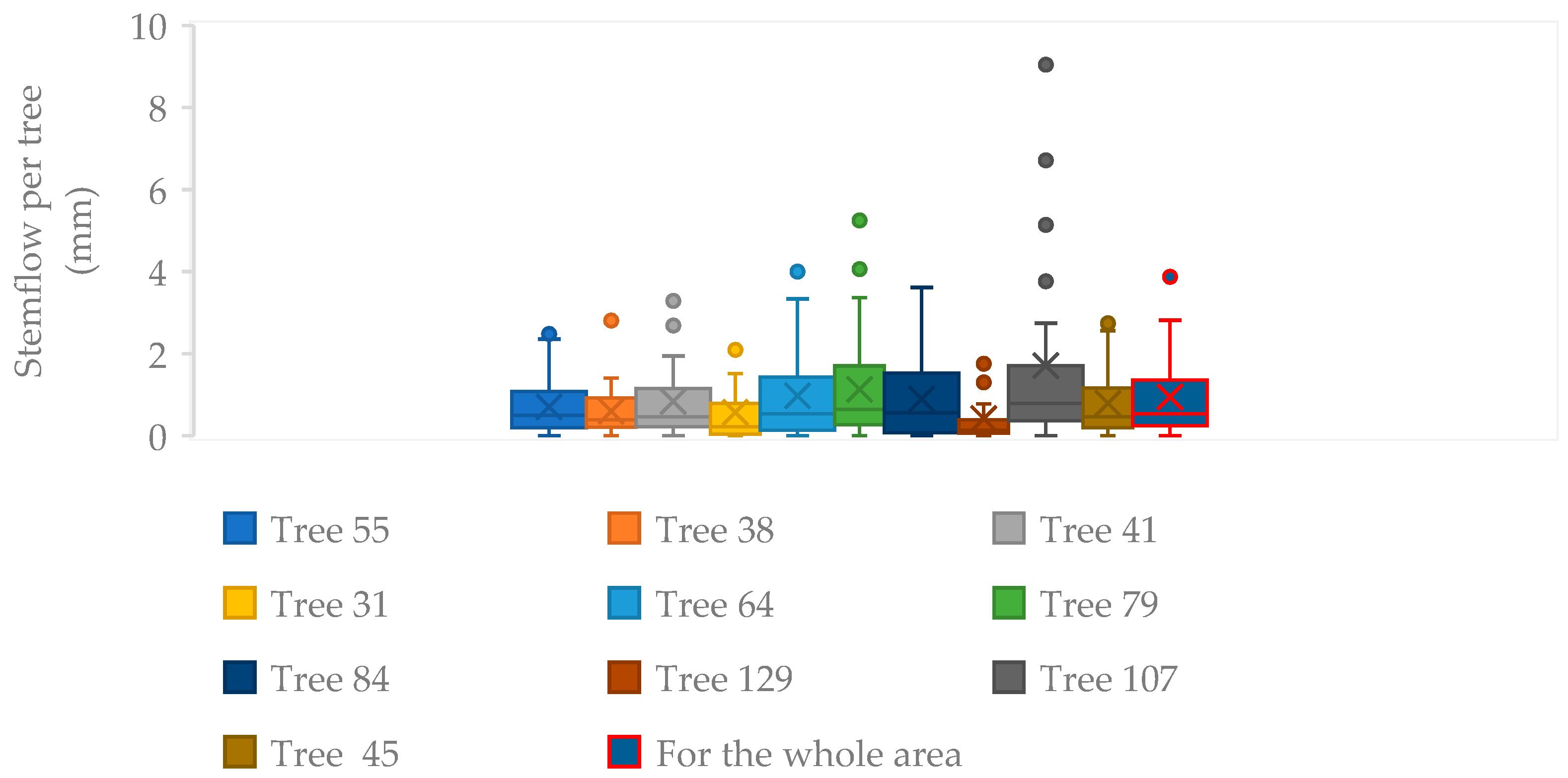 - Hanchi, A.; Rapp, M. Stemflow determination in forest stands. For. Ecol. Manag. 1997, 97, 231–235. [Google Scholar] [CrossRef]