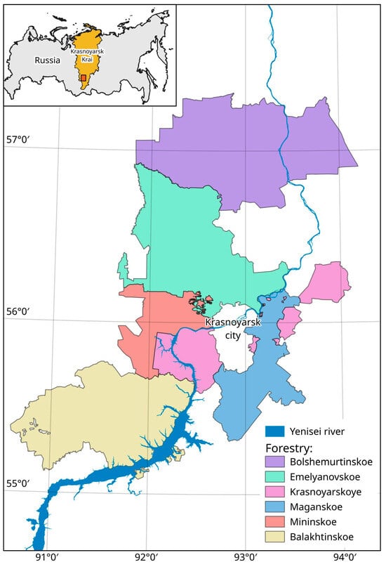 The research was conducted in herb-rich birch forests (mesophilic herbs and tall herbs groups of forest types) within six forest management units in the vicinity of the city of Krasnoyarsk (Figure 1). These forest management units are characterized by the greatest representation of birch forests in the region. The relative area of birch-dominated stands ranges from 17% (Mininskoe forest management unit) to 47% (Balakhtinskoe forest management unit) [34]. In accordance with the adopted forest zoning classification system, the studied forest stands are categorized as part of the Central Siberian subtaiga-forest steppe region of the forest steppe zone and the Altai–Sayan mountain taiga region of the South Siberian mountain zone [7].