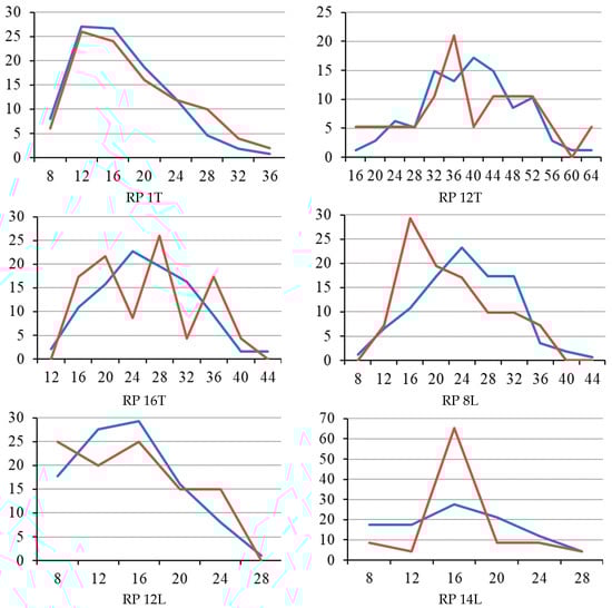 Trees of differing sizes (diameters) are susceptible to stem rot within Betula pendula dendrocenoses. A comparative analysis was performed using the λ criterion [54] of tree diameter distribution series, with data from research plots considered disease centers (stem rot prevalence rate is more than 10%). In most cases, the analysis did not reveal significant differences between the diameter structure of the entire stand and trees infected with stem rot (Figure 2, Table 7). The mean diameter of both the healthy trees and those infected with stem rot is found to be similar. In summary, stem rot has been observed to affect trees of various sizes. The severity of the affliction has been found to correlate with their proportion within the stand structure. However, instances of deviation from this pattern are documented, notably in the cases of RP 8L and 14L. These deviations can be attributed to the impact of chaos, which has been observed to inflict damage on trees of various sizes. The underlying mechanism is believed to be the frequent invasion of wood-decay fungi, which enter the tree through mechanical wounds that occur accidentally on the trunks. Examples of such wounds include frost cracks and directional notches.