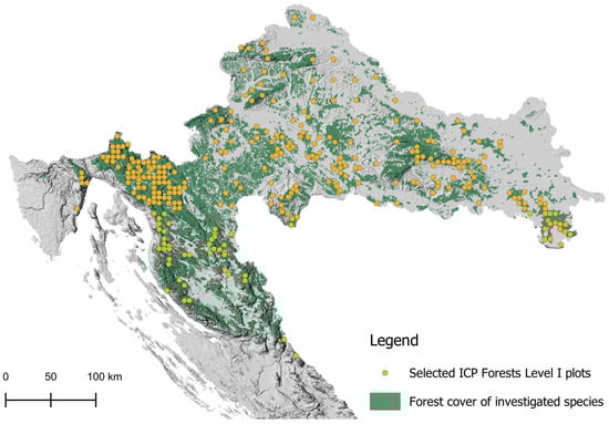 Figure 1. Selected ICP Forests Level I monitoring plots in Croatia and forest cover of investigated species.