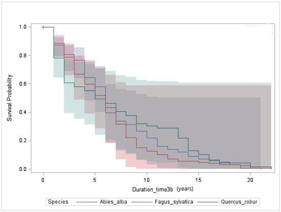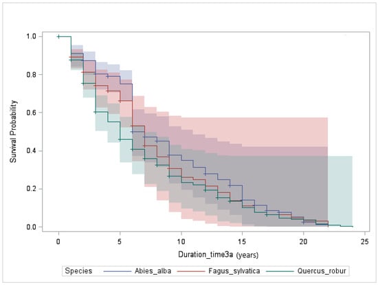 Table 2 summarizes the Kaplan–Meier (KM) survival estimates comparing regeneration durations for defoliation classes 3a and 3b. For class 3a crown regeneration, a statistically significant difference was found between silver fir and oak (p = 0.002), and a marginally significant difference between beech and oak (p = 0.076).