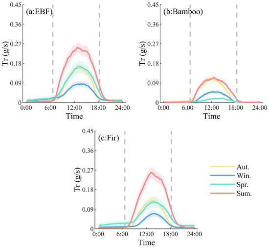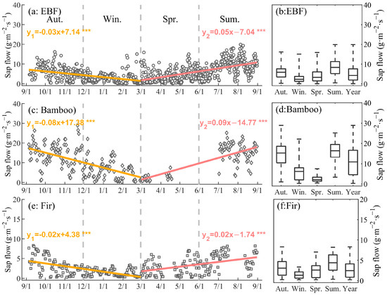 3.1. Sap Flow Differences Among Evergreen Broad-Leaved, Bamboo, and Fir Forests