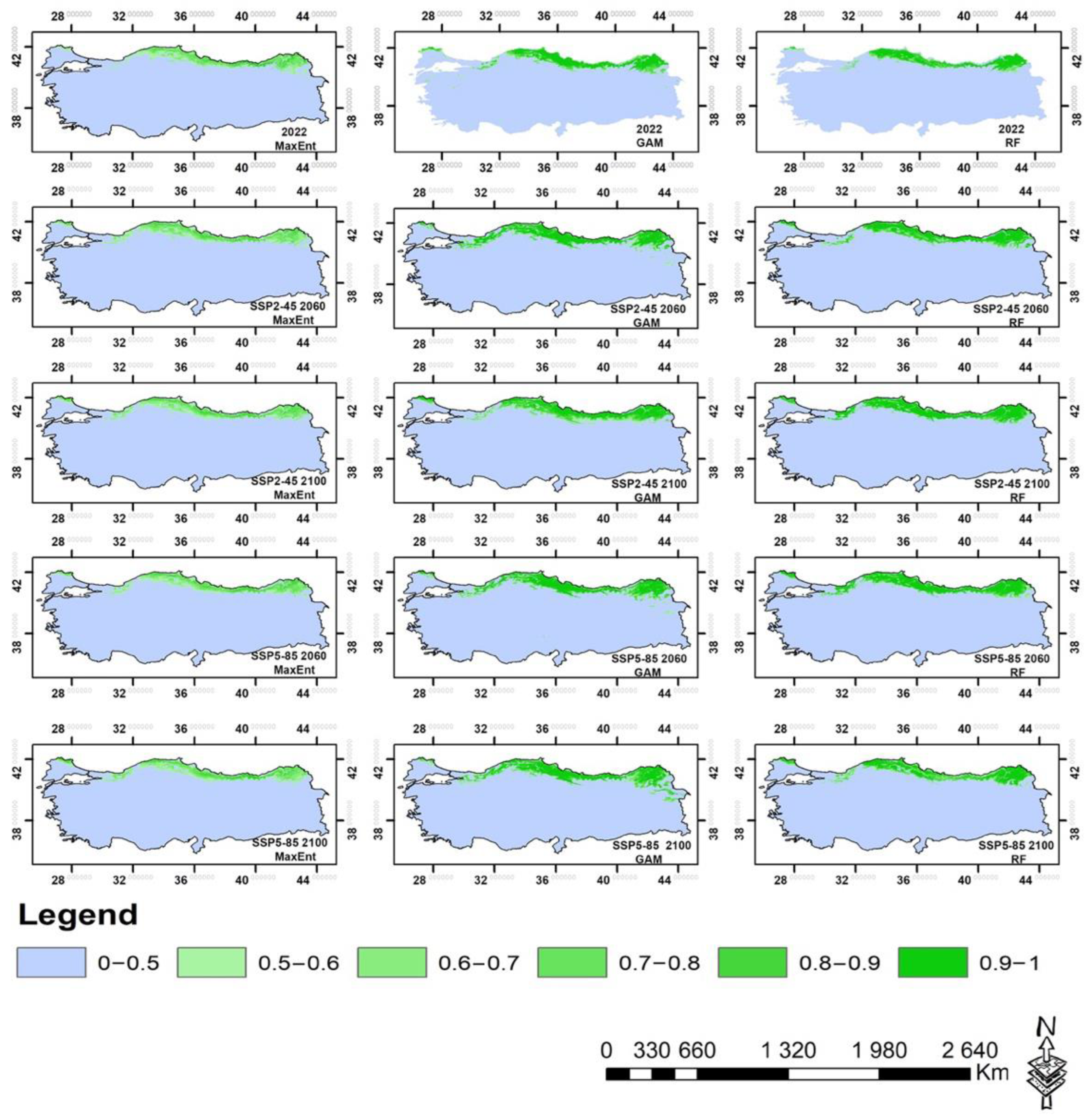 Chicago/Turabian StyleCanturk, Ugur, İsmail Koç, Ramazan Erdem, Ayse Ozturk Pulatoglu, Sevgi Donmez, Nuri Kaan Ozkazanc, Hakan Sevik, and Halil Baris Ozel. 2025. "Climate-Driven Shifts in Wild Cherry (Prunus avium L.) Habitats in Türkiye: A Multi-Model Projection for Conservation Planning" Forests 16, no. 9: 1484. https://doi.org/10.3390/f16091484