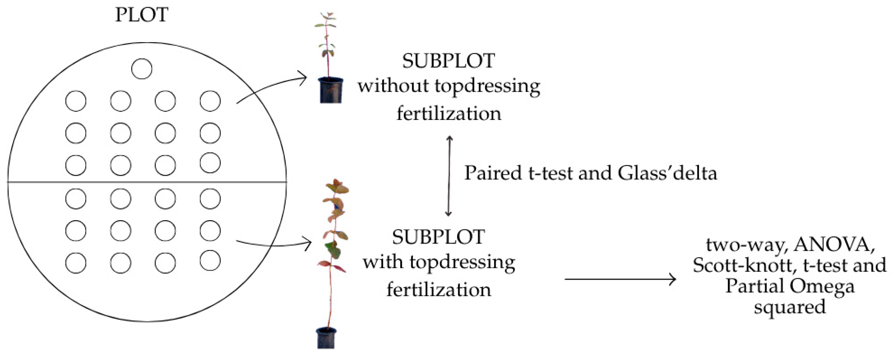 - Souza Kulmann, M.S.; Arruda, W.S.; Vitto, B.B.; Souza, R.O.S.; Berghetti, Á.L.P.; Tarouco, C.P.; Araujo, M.M.; Nicoloso, F.T.; Schumacher, M.V.; Brunetto, G. Morphological and physiological parameters influence the use efficiency of nitrogen and phosphorus by Eucalyptus seedlings. New For. 2022, 53, 431–448. [Google Scholar] [CrossRef]