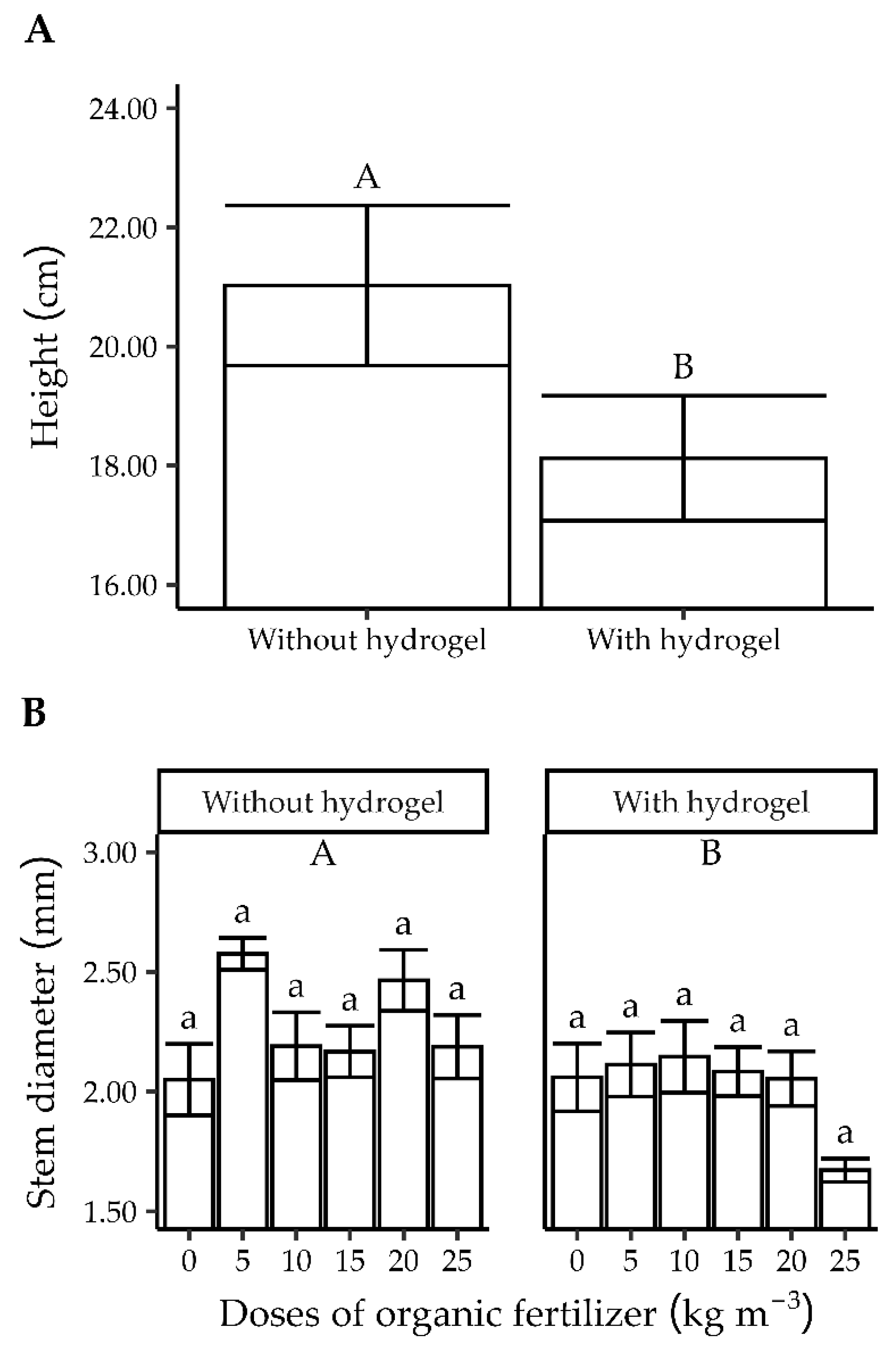 Length (cm) | Without hydrogel | 412.37 Aa | 301.30 Ab | 235.81 Ab | 239.86 Ab | 261.74 Ab | 249.85 Ab |