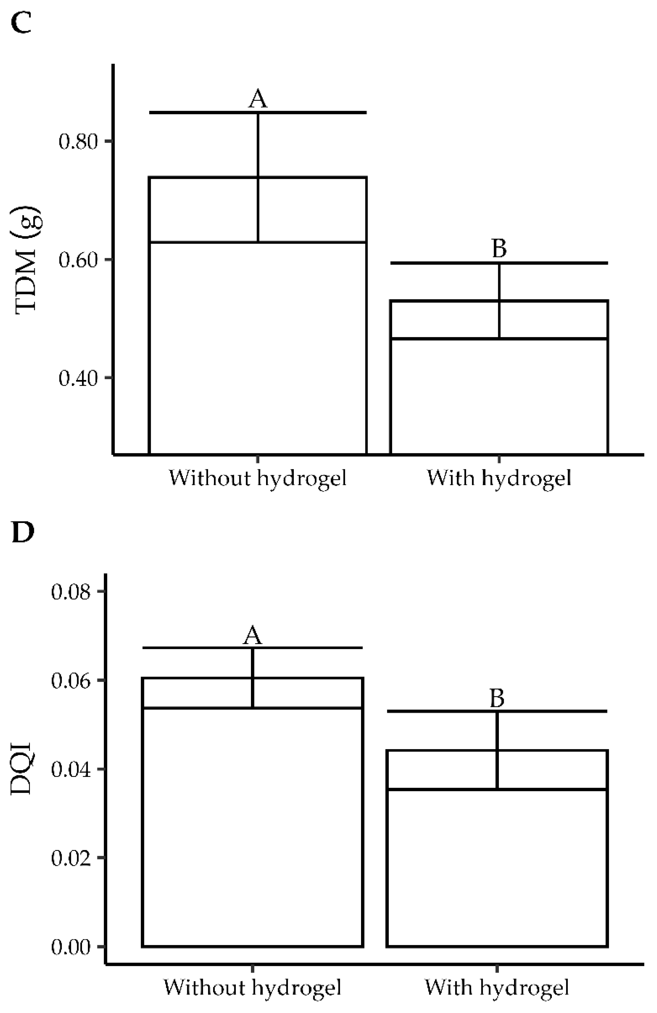 With hydrogel | 544.75 Bb | 1087.50 Aa | 928.50 Aa | 600.25 Ab | 705.50 Ab | 812.00 Aa | |